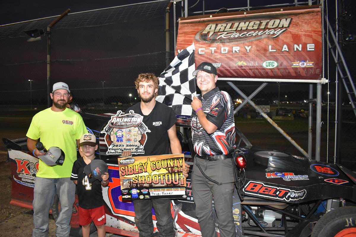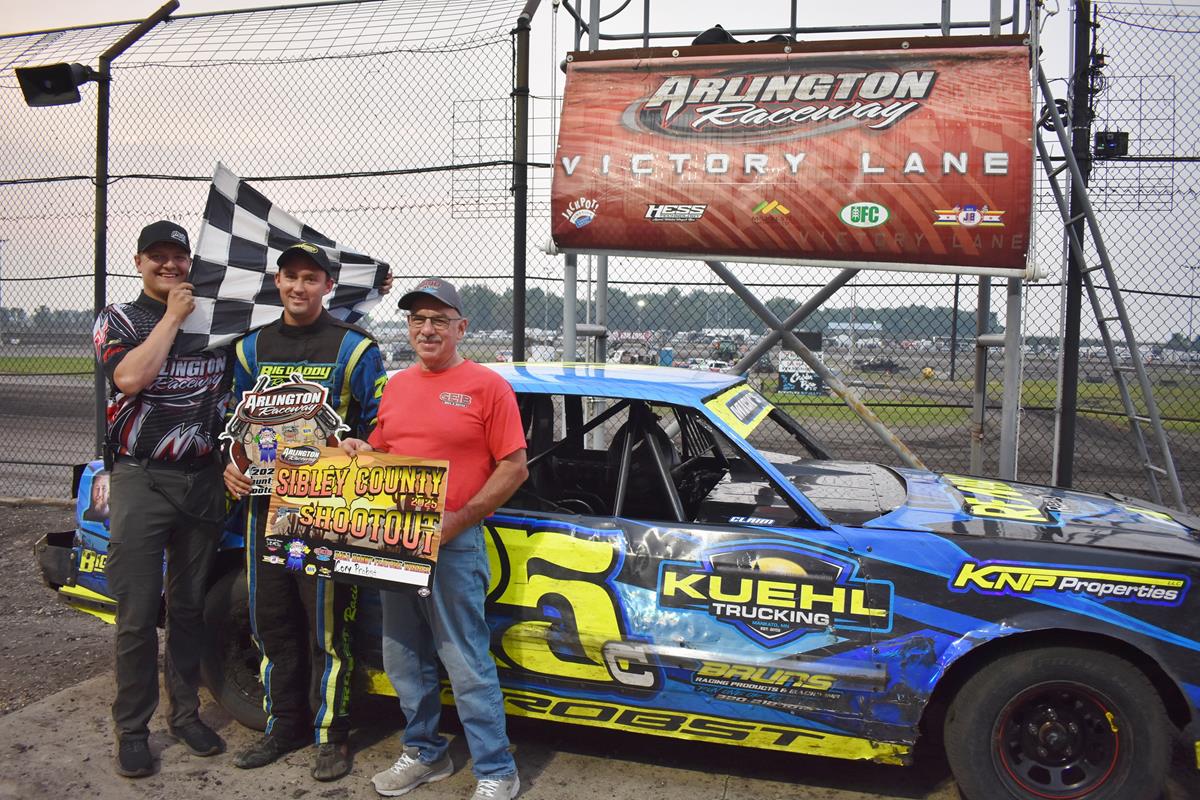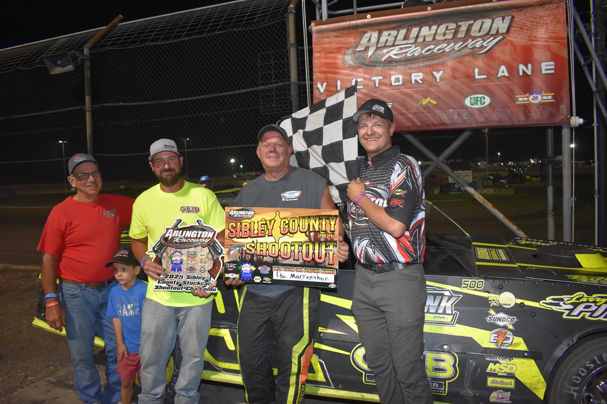 Dan Mackenthun wins his biggest career payday at the Sibley County Fair Stock Car Shootout at the Arlington Raceway. The event paid $5,000 to win plus he received an extra $1,725.00 for leading 23 laps of the 30 lap feature and an extra $100 for his heat race win, this also secures him a position in the B&B Racing Chassis Allstar race Thirty six stock cars signed in all looking for the top prize and extra bonus awards for a total of a $30,000 purse. The event was sponsored by Geib Well & Water and presented by Justice Brothers. Heat races were furious as the drivers were paid $100 to win the race, the My Race Pass fastest heat race time extra $100 was given to Josh Larsen. The first heat was probably the funnest to watch as there was a battle between Jake Bruns and Andrea McCain, Bruns led from the start and with two laps to go Kaden Woodie and Andrea McCain switched spots with Bruns still leading then coming out of turn 4 McCain dove down and by mere feet took the win at the checkered flag with Woodie taking 2nd and Bruns following in 3rd for an exciting finish. Other heat race winners were Dan Menk, Dan Mackenthun, Matt Looft and AJ Zimmerman securing them all a spot in the redraw. Jake McBirnie won the pistol shootout in the Justice Brothers Redraw as he shot and won the #1 draw card putting him on the pole. He also pulled a position draw giving Andrea McCain $500 before the race even began.